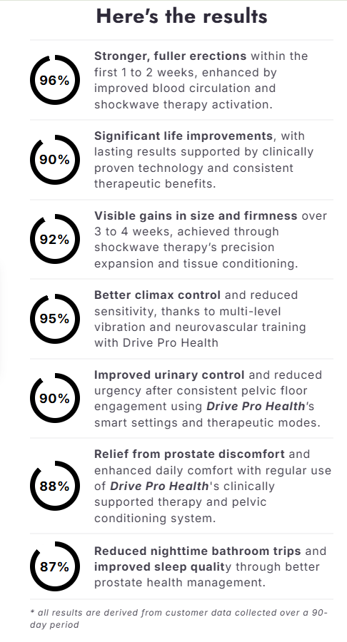 Drive Pro Health combine low-intensity shockwave therapy with targeted vibration, can effectively boost blood flow, improve tissue elasticity, support nerve responsiveness, promote healthy prostate function, and support overall prostate health. When used consistently, they offer a safe, drug-free way to enhance erectile function and maintain prostate wellness — grounded in clinical principles of men's health recovery.”